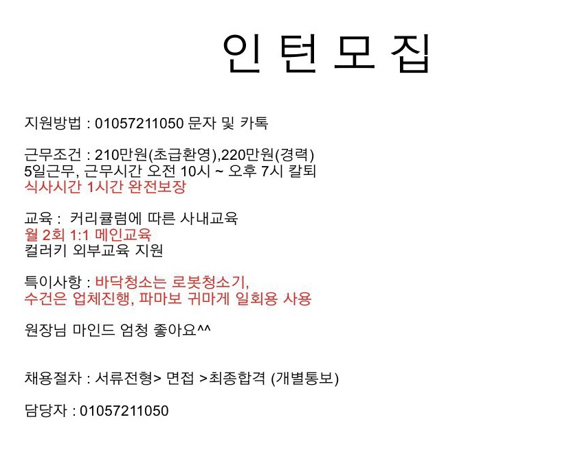 스태프 초급 1명 / 월급 210만 이상