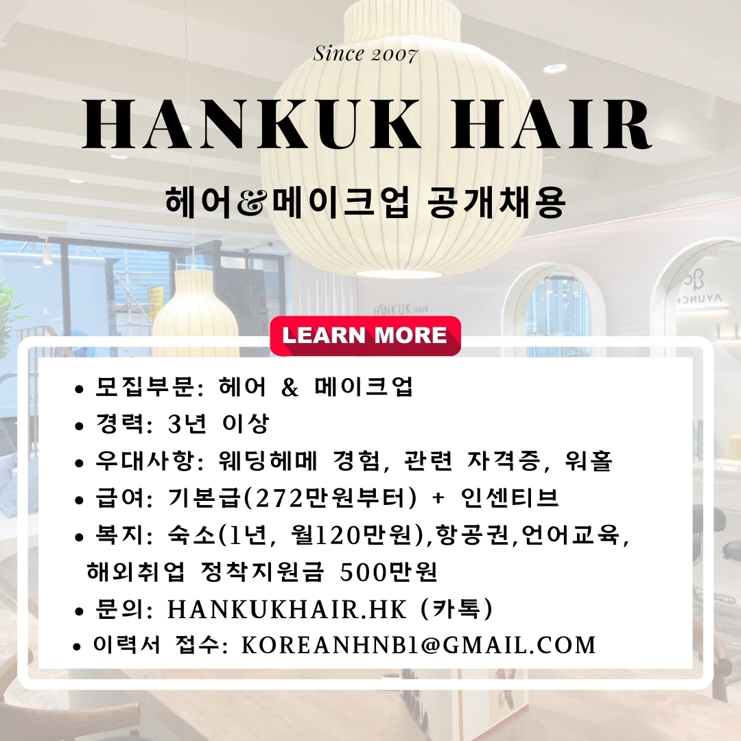 홍콩에서 제~~일 잘나가는 한국미용실에서 제~~일 잘나가는 실력있고 열정있는 디자이너 선생님과 메이크업사 구인합니다.